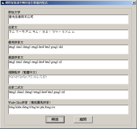 中文譯音查詢,可以應用於網站、大型主機系統、個人電腦,下圖為一個單機個人用版範例,輸出時 可以選擇注音、漢語拼音、通用拼音、注音二式、耶魯拼音、Wade-Gilos威妥瑪拼音,也可以選擇是否帶聲調。